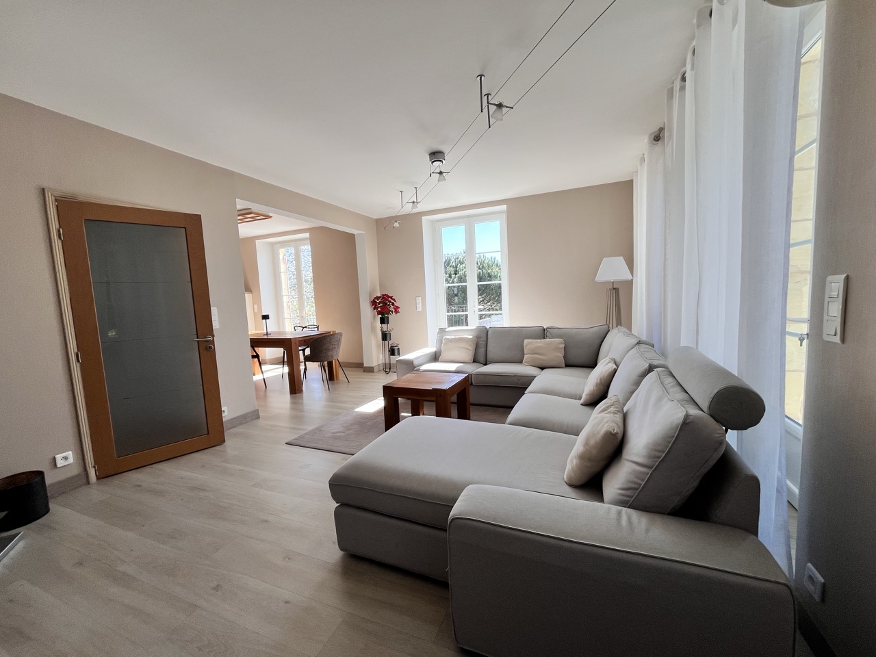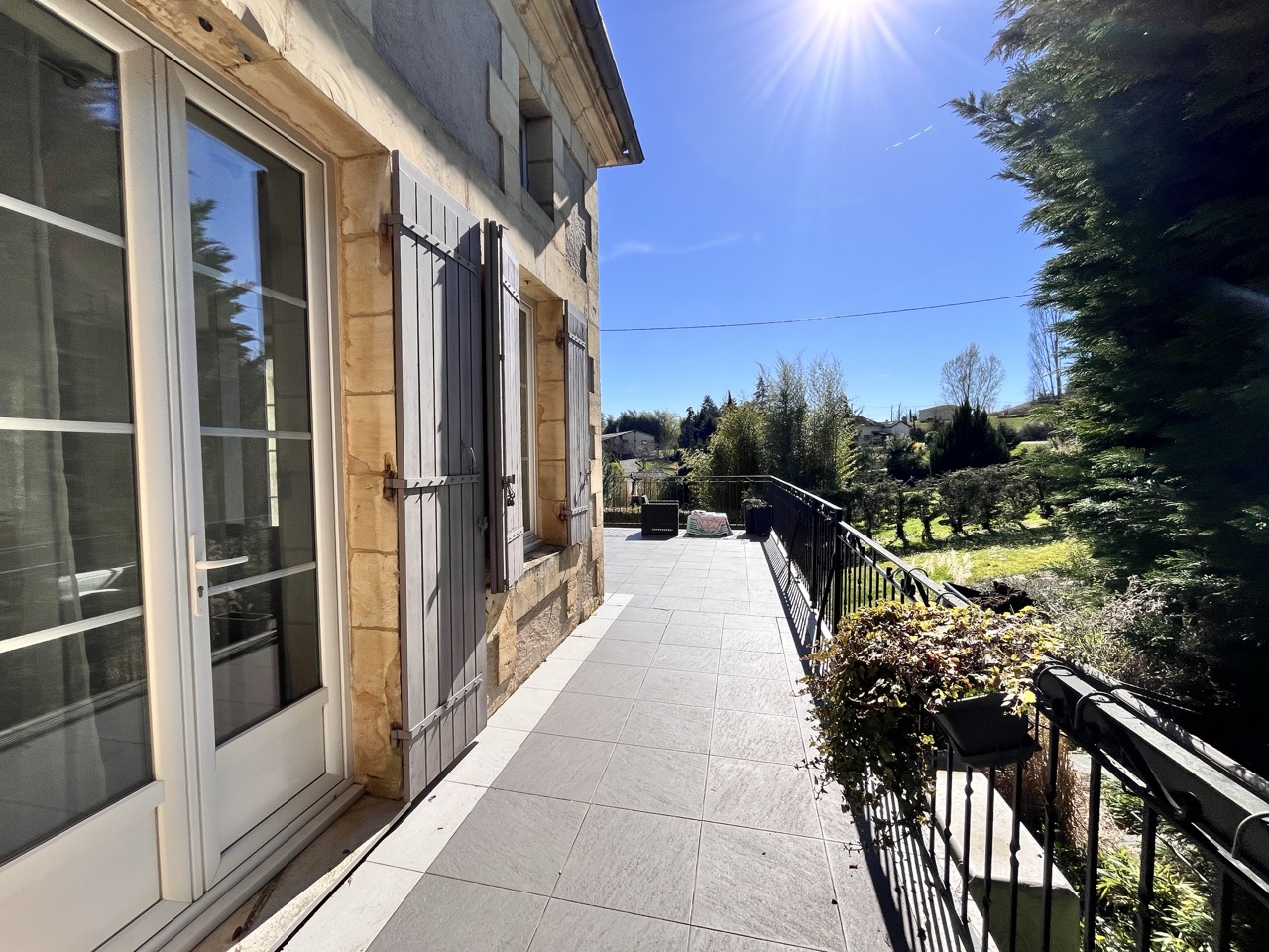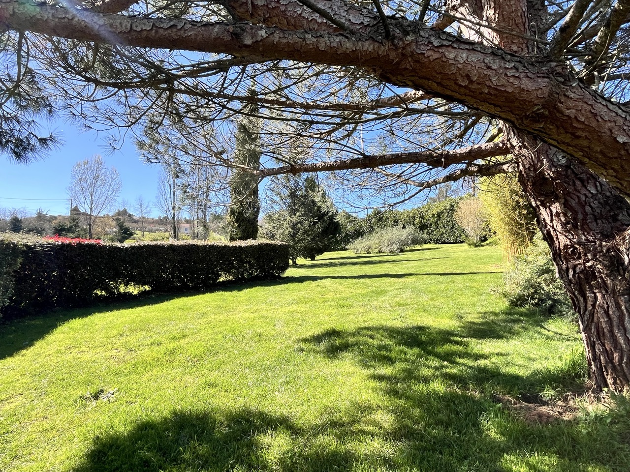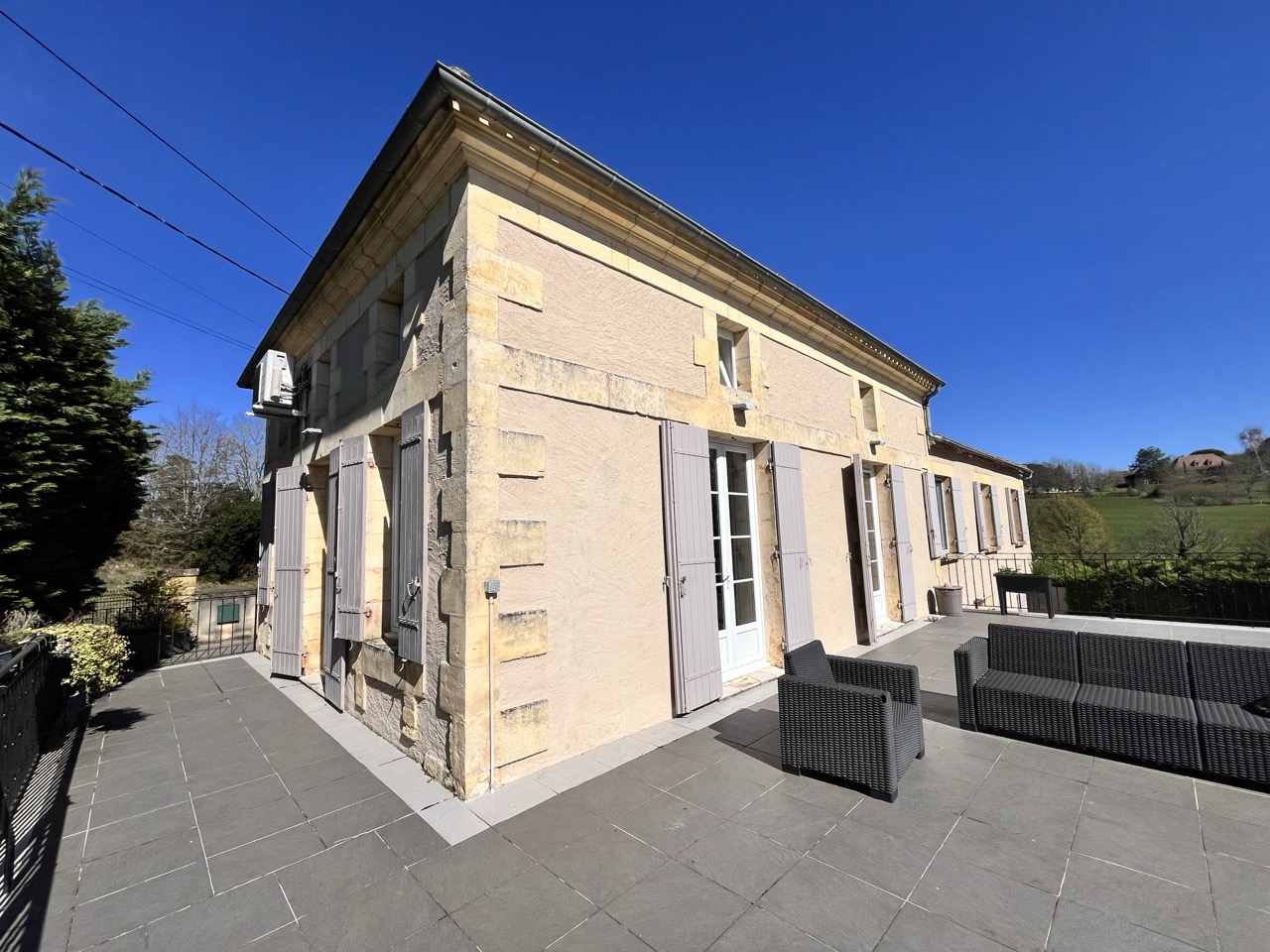 La résidence principale en pierre est TRÈS LUMINEUSE, ornée de grandes fenêtres ouvertes sur les terrasses dallées, véritables pièces de vie à ciel ouvert offrant une jolie vue sur le parc de 9127 m2 délicatement paysagé. Le rez-de-jardin est aménagé en appartement pouvant recevoir des amis en toute indépendance.